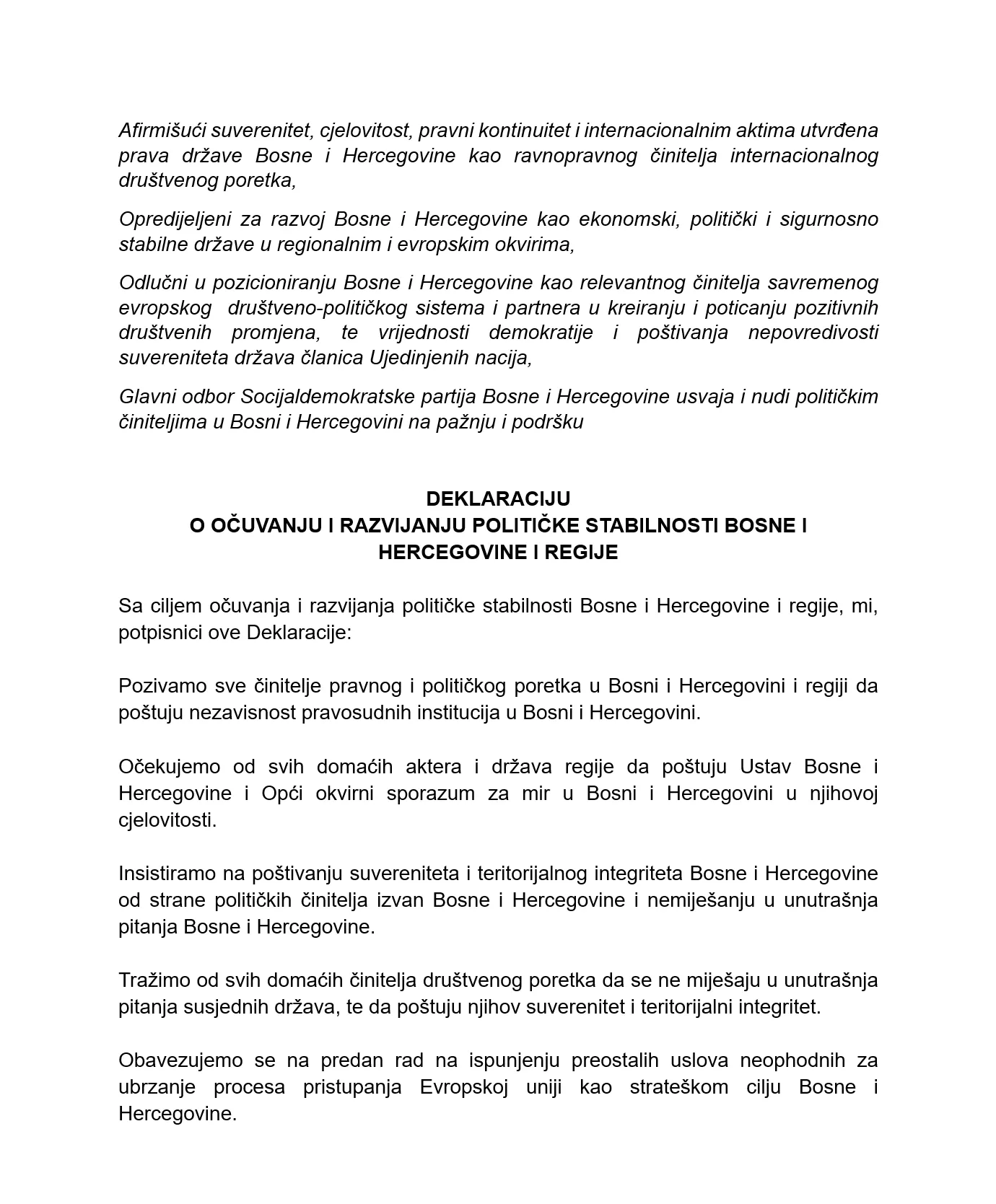 U skladu s tim, Glavni odbor SDP BiH je donio i Deklaraciju o očuvanju i razvijanju političke stabilnosti u BiH i regiji, koja će biti ponuđena svim političkim akterima na potpis.