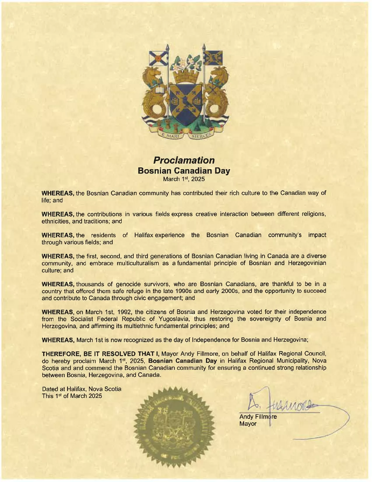 Gradonačelnik Halifaxa Andy Fillmore i gradonačelnik Edmontona Amarjeet Sohi su izdali proklamacije kojima su potvrdili bogatu kulturu, historiju i tradiciju bosanskohercegovačkih Kanađana. Istovremeno su jasno podržali državu Bosnu i Hercegovinu, podržali jedan od najvažnijih državnih praznika, Dan nezavisnosti, istakli doprinos bosanskohercegovačke zajednice u Kanadi na različitim poljima i priznali genocid u Srebrenici.