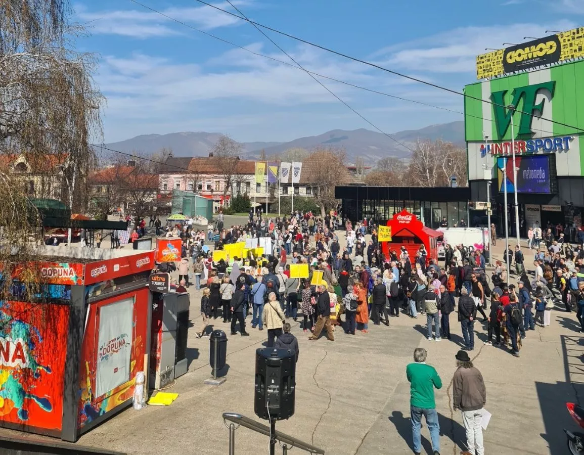 (Patria) - Peta nedjeljna mirna šetnja i skup u organizaciji Neformalne grupe "Zenica ustaje", koji je u 12.30 sati počeo na Trgu Alije Izetbegovića u tom gradu, počela je minutom šutnje za stradale u prošlogodišnjim poplavama i klizištima u Jablanici kod Mostara.