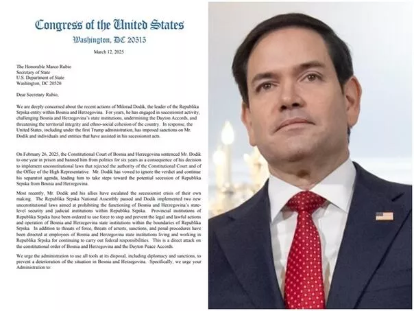 Dana 26. februara 2025. godine, Ustavni sud Bosne i Hercegovine osudio je gospodina Dodika na jednu godinu zatvora i zabranio mu političko djelovanje na šest godina kao posljedicu njegove odluke da implementira neustavne zakone koji su odbacili autoritet Ustavnog suda i Ureda visokog predstavnika. Gospodin Dodik je obećao da će ignorisati presudu i nastaviti sa svojom separatističkom agendom, što ga je navelo da preduzme korake ka mogućem otcjepljenju Republike Srpske od Bosne i Hercegovine, stoji u pismu.