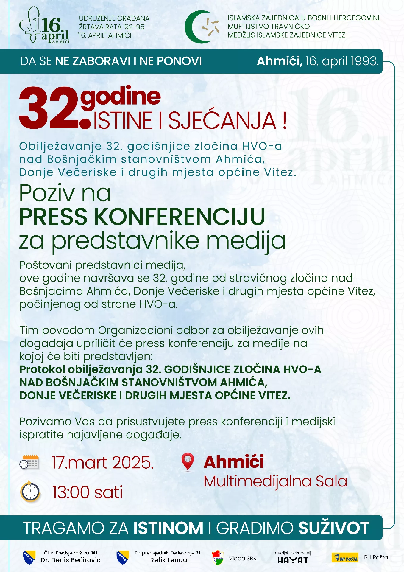 Na konferenciji će biti predstavljen Protokol obilježavanja 32. godišnjice zločina HVO-a nad bošnjačkim stanovništvom Ahmića, Donje Večeriske i drugih mjesta općine Vitez.