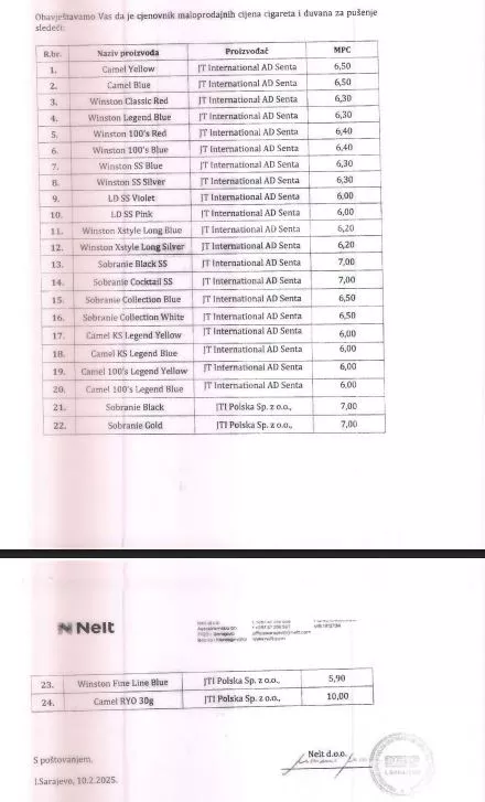 Kako su naveli, od danas su na snazi nove maloprodajne cijene cigareta brendova Camel, Winston, LD i Sobranie.
