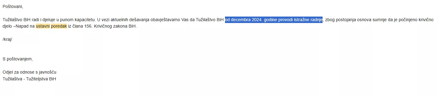 Odgovor Tužilaštva BiH dostavljen medijima 6. marta