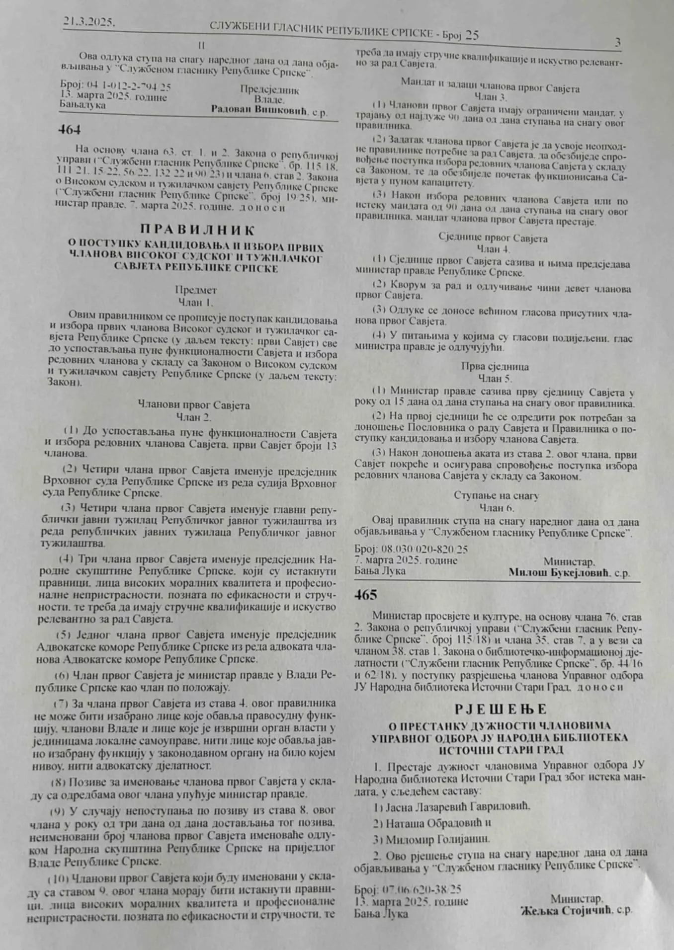 U Službenom glasniku Rs od 21. marta objavljen je Pravilnik o postupku kandidovanja i izboru prvih članova Visokog sudskog i tužilačkog savjeta Rs, a stupio je na snagu 22. marta.
