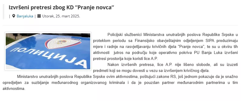 "Policijski službenici Ministarstva unutrašnjih poslova Republike srpske u proteklom periodu sa Finansijsko obavještajnim odjeljenjem SIPA preduzimaju mjere i radnje na rasvjetljavanju krivičnih djela "Pranje novca", te su u okviru tih aktivnosti jutros na području koje operativno pokriva PU Banja Luka izvršeni pretresi prostorija koje koristi lice A.P. Nakon izvršenih pretresa, lice A.P. nije lišeno slobode, ali su izuzeti predmeti koji se mogu dovesti u vezu sa izvršenjem krivičnog djela.