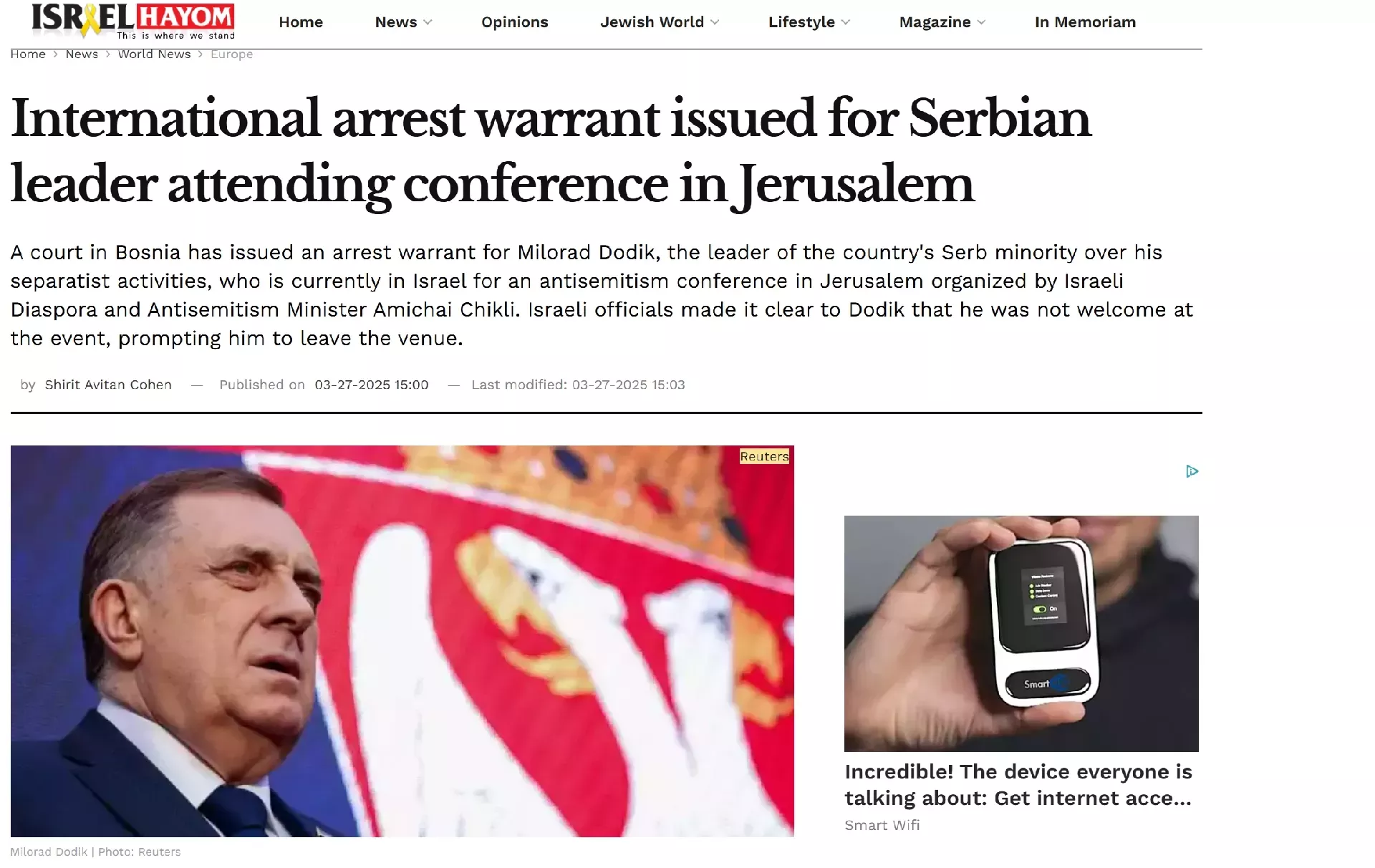 (Patria) - Kad je predsjednik Republike srpske Milorad Dodik jučer sjeo sa mnom da obavimo ekskluzivni intervju u uredima The Jerusalem Posta u Jerusalemu, učinio je to na vlastiti zahtjev.