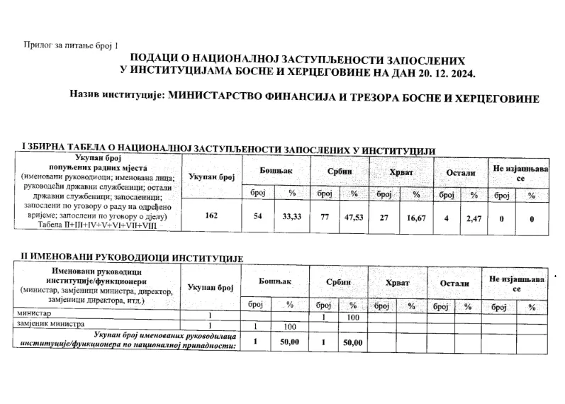 Ministarstvo finansija i trezora ima 162 uposlena, a od toga je 77 Srba, 54 Bošnjaka, 27 Hrvata i 4 iz reda Ostalih.