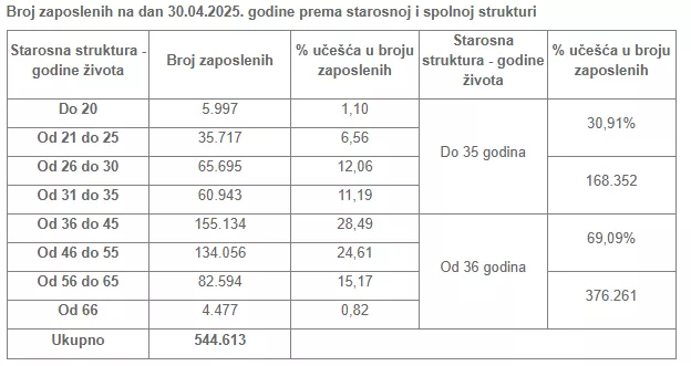 Kada je riječ o starosnoj strukturi, podaci pokazuju da je najveći broj radnog stanovništva u dobi od 46 do 65+ i to 221.127, dok je u dobi od 20 do 35 godina 168.352 zaposlenih. Od 35 do 46 godina je 155.134 zaposlenih.
