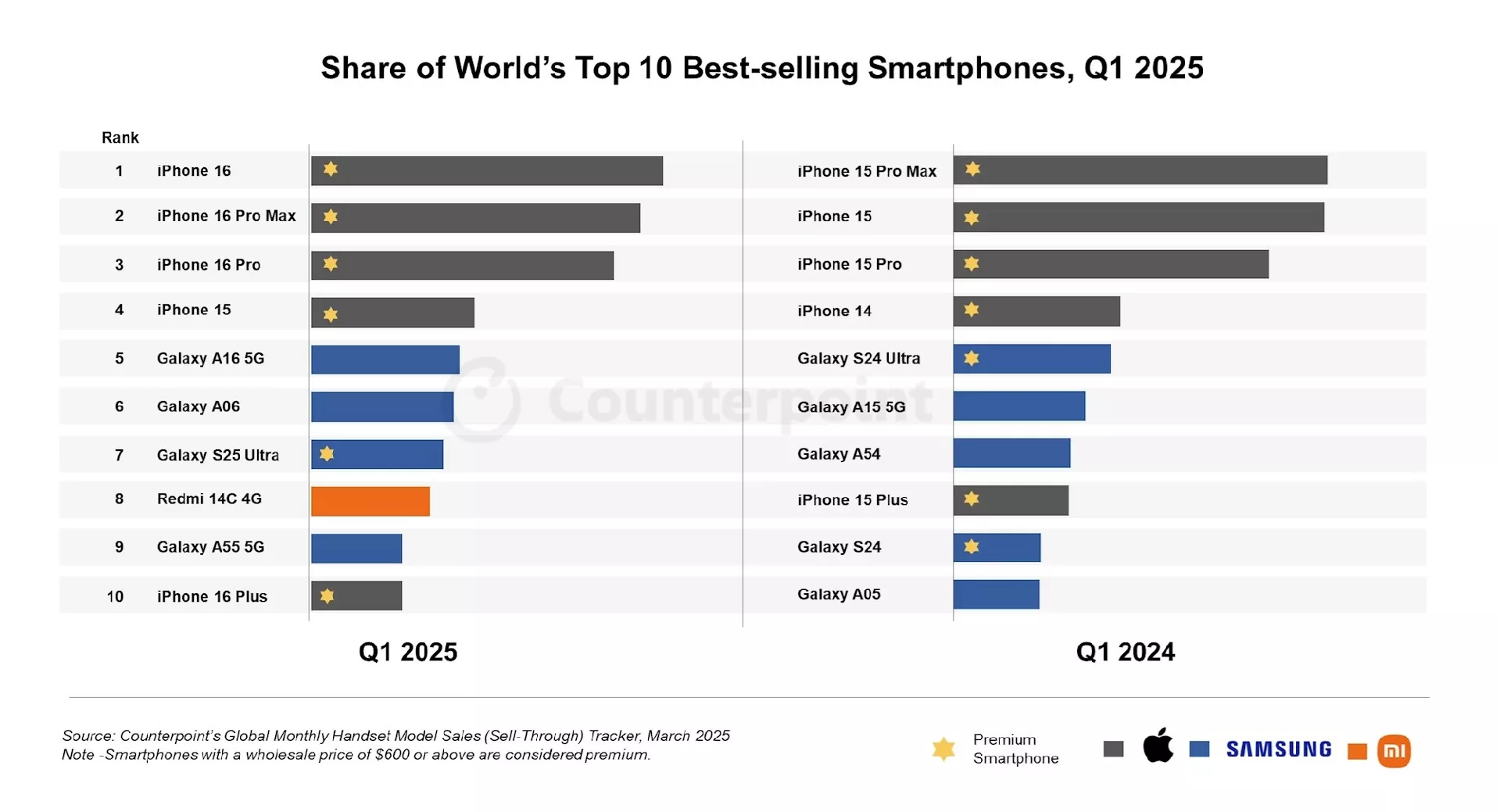 Jedini model među deset najprodavanijih koji nije iz Applea ili Samsunga je Redmi 14C 4G iz Xiaomija, koji je završio na osmom mjestu zahvaljujući velikom rastu prodaje u Africi, Latinskoj Americi i na Bliskom istoku.