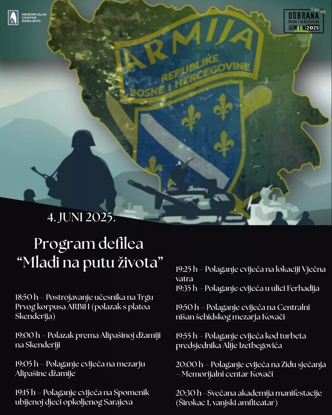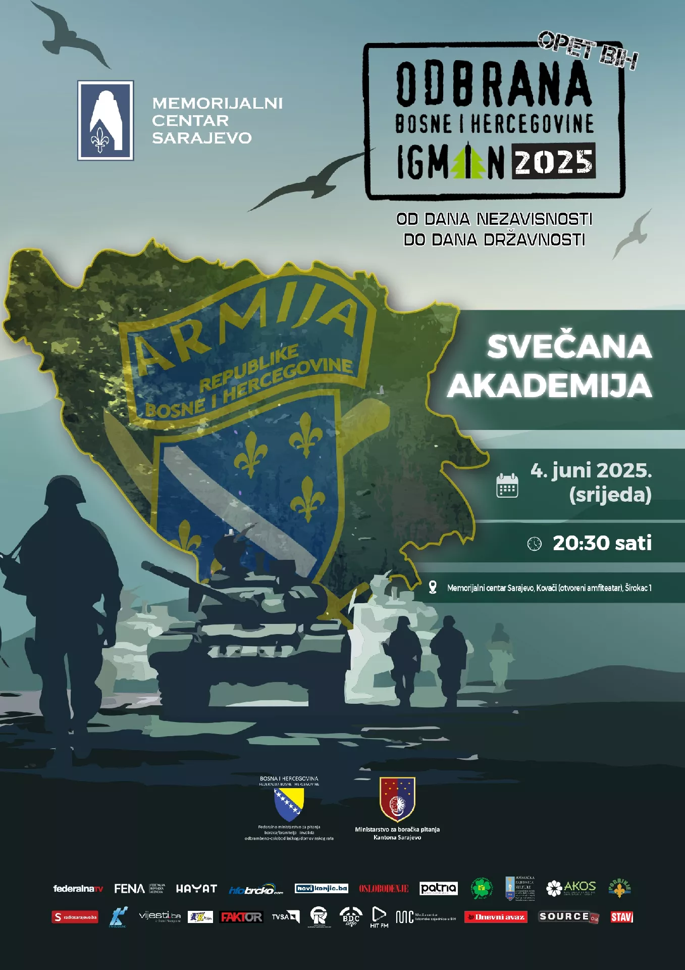 (Patria) - U Memorijalnom centru Sarajevo na Kovačima večeras će, s početkom u 20.30 sati, biti upriličena svečana akademija povodom manifestacije "Odbrana Bosne i Hercegovine - Igman 2025 - od Dana nezavisnosti do Dana državnosti".