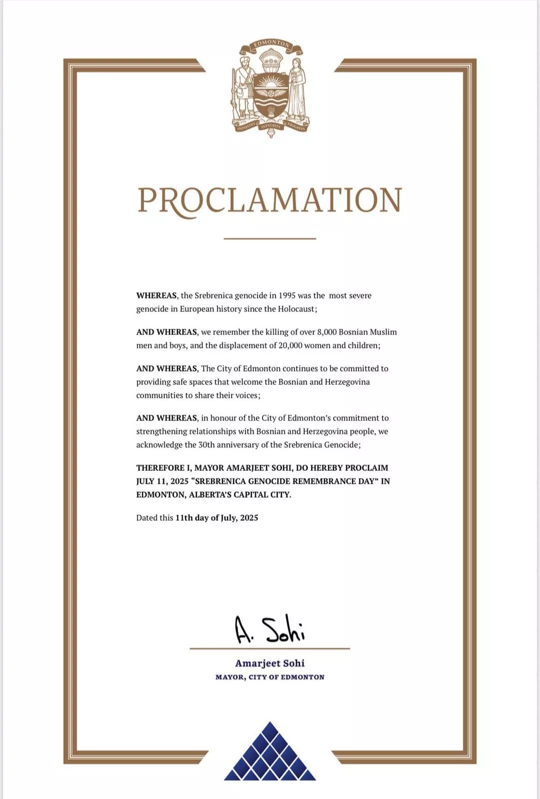 STOGA JA, GRADONAČELNIK AMARJEET SOHI, OVIM PROGLAŠAVAM 11. JULI 2025. „DAN SJEĆANJA NA GENOCID U SREBRENICI“ U EDMONTONU, GLAVNOM GRADU ALBERTE.