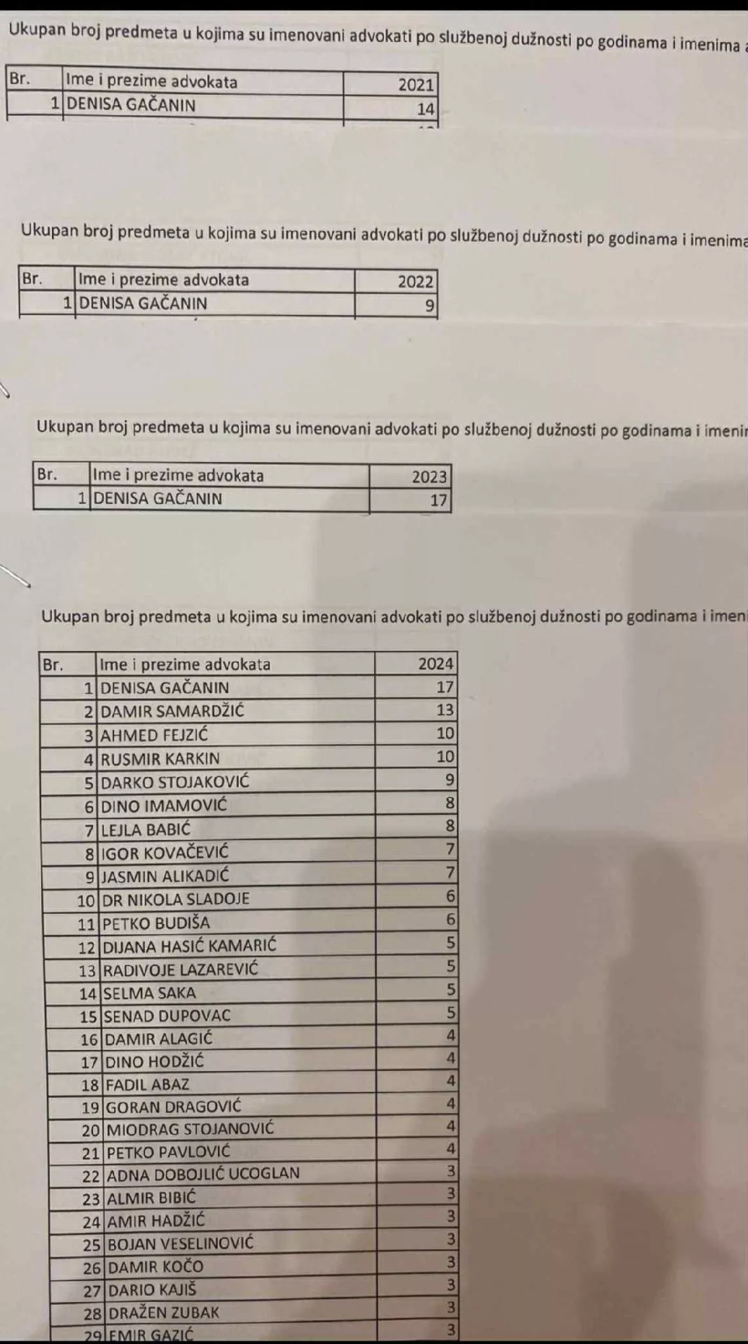 Najveći broj predmeta u tom smislu u prošloj godini dobila je advokatica Denisa Gačanin, nekadašnja saradnica bivšeg državnog tužitelja Dubravka Čampare, ukupno 17. Većinu predmeta dobila je zajedničkim djelovanjem Čampare i tužitelja Džermina Pašića. Po saznanjima Istrage ukupno je dobila 57 predmeta po službenoj dužnosti za četiri godine i to u 2021. godini 14, u 2022. 9, a u 2023. i 2024. po 17 predmeta. U broju dobijenih predmeta Gačanin je ubjedljivo prva na listi za prošlu 2024. godinu. Na drugom mjestu u istoj godini je Damir Samardžić sa 13 predmeta, a zatim Ahmed Fejzić i Rusmir Karkin sa 10 predmeta dobijenih po službenoj dužnosti.