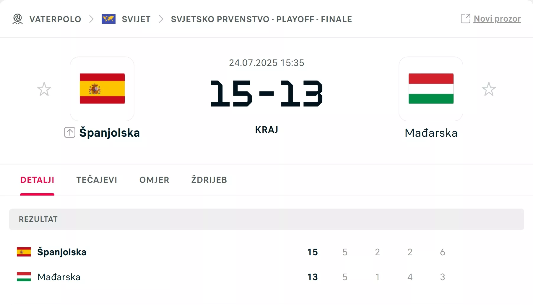 (Patria) - Reprezentacija Španije pobijedila je danas u finalu Svjetskog vaterpolskog prvenstva Mađarsku rezultatom 15-13.