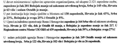 U materijalu koji je dostavljen zastupnicima analizirane su 74 institucija na nivou BiH, a Bošnjaci su u debalansu u 62 institucije uzimajući u obzir broj koji im pripada prema zakonima Bosne i Hercegovine. Posebno zabrinjava činjenica da je na višerangiranim pozicijama, koje su rukovodeće i bolje plaćene, Bošnjaka znatno manje, ali ih ima više na pozicijama zaposlenika sa srednjom stručnom spremom što zamagljuje ukupan broj zaposlenih i stvarno stanje.
