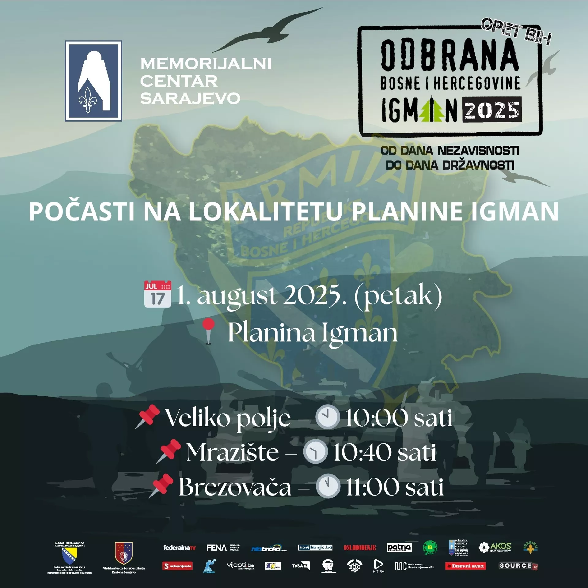 (Patria) - Memorijalni centar Sarajevo poziva sve građane, porodice šehida i poginulih boraca, veterane, boračka udruženja, institucije i predstavnike svih nivoa vlasti da prisustvuju vjerskom programu manifestacije „Odbrana Bosne i Hercegovine – Igman 2025 - od Dana nezavisnosti do Dana državnosti“, čiji će centralni događaj – Dova za domovinu – biti održan u petak, 1. augusta 2025. godine, sa početkom u 12:00 sati, na platou ratne džamije na Igmanu.