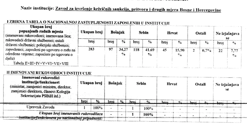 Prema ovim podacima 45 Bošnjaka je manje zaposleno u Zavodu nego što im pripada po Ustavu BiH i zakonu.