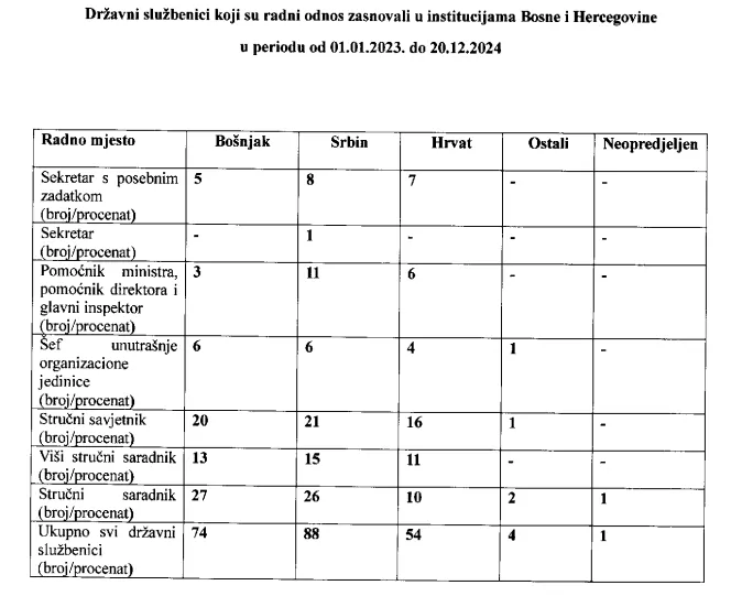 Agencija za državnu službu BiH tokom 2023. i 2024. godine provela je više od 50 javnih konkursa na kojima je primljena 221 osoba u radni odnos u institucijama Bosne i Hercegovine i to 88 Srba, 74 Bošnjaka, 54 Hrvata, četiri iz reda ostalih i jedan neopredijeljen.