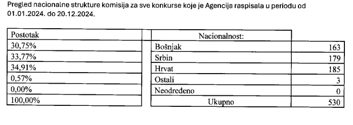 Pokazuje to i nacionalna struktura koju je Agencija za državnu službu BiH dostavila u odgovoru na zastupničko pitanje Jasmina Emrića u januaru ove godine. Pa je tako za konkursne procedure u 2024. godini imenovano 530 osoba, a najviše je članova iz reda Hrvata 185, zatim Srba 179, Bošnjaka 163, a iz reda ostalih troje.