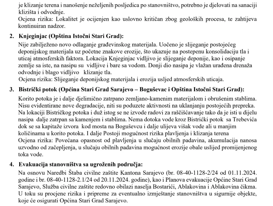 "Na terenu se odvijaju ozbiljni geološki procesi, redovno zabilježeni od strane nadležnih službi: Formiranje i širenje pukotina te stabilno pomjeranje tla — rezultat konstantne destabilizacije terena.
