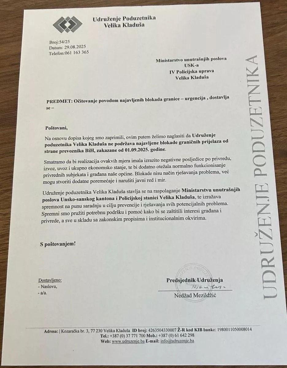 (Patria) - Udruženje poduzetnika Velika Kladuša oglasilo se povodom najavljenih blokada graničnih prijelaza koje su za 1. septembar 2025. godine najavili pojedini prevoznici iz BiH.