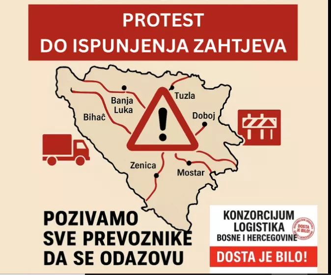 (Patria) - Od 6.00 sati širom Bosne i Hercegovine počinje protest autoprijevoznika, u organizaciji Konzorcija Logistika BiH.