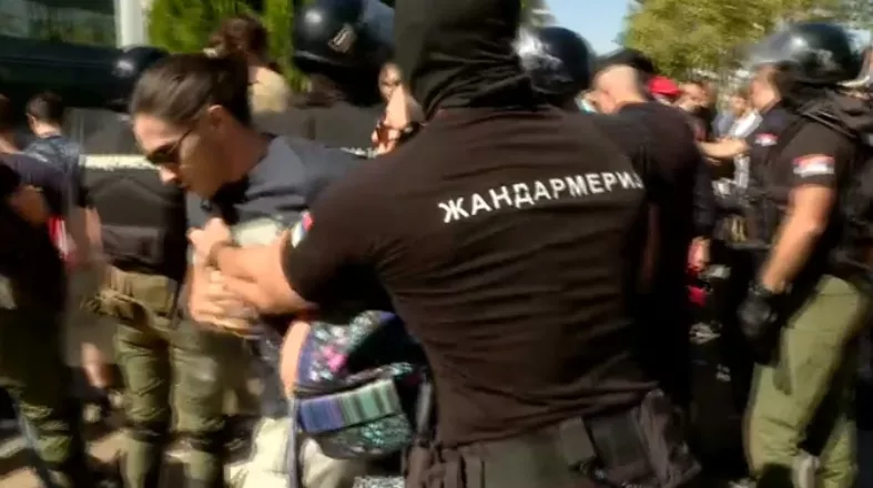 Žandarmerija u punoj opremi za razbijanje demonstracija potiskuje okupljene ka obližnjim poslovnim zgradama, javlja N1 Srbija.