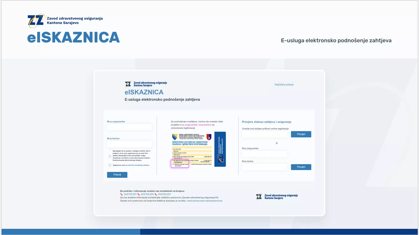 1. Putem portala www.kzzosa.ba ili www.ezk.ezoblak.ba podnosite eZahtjev unosom broja osiguranika i broja kartice.