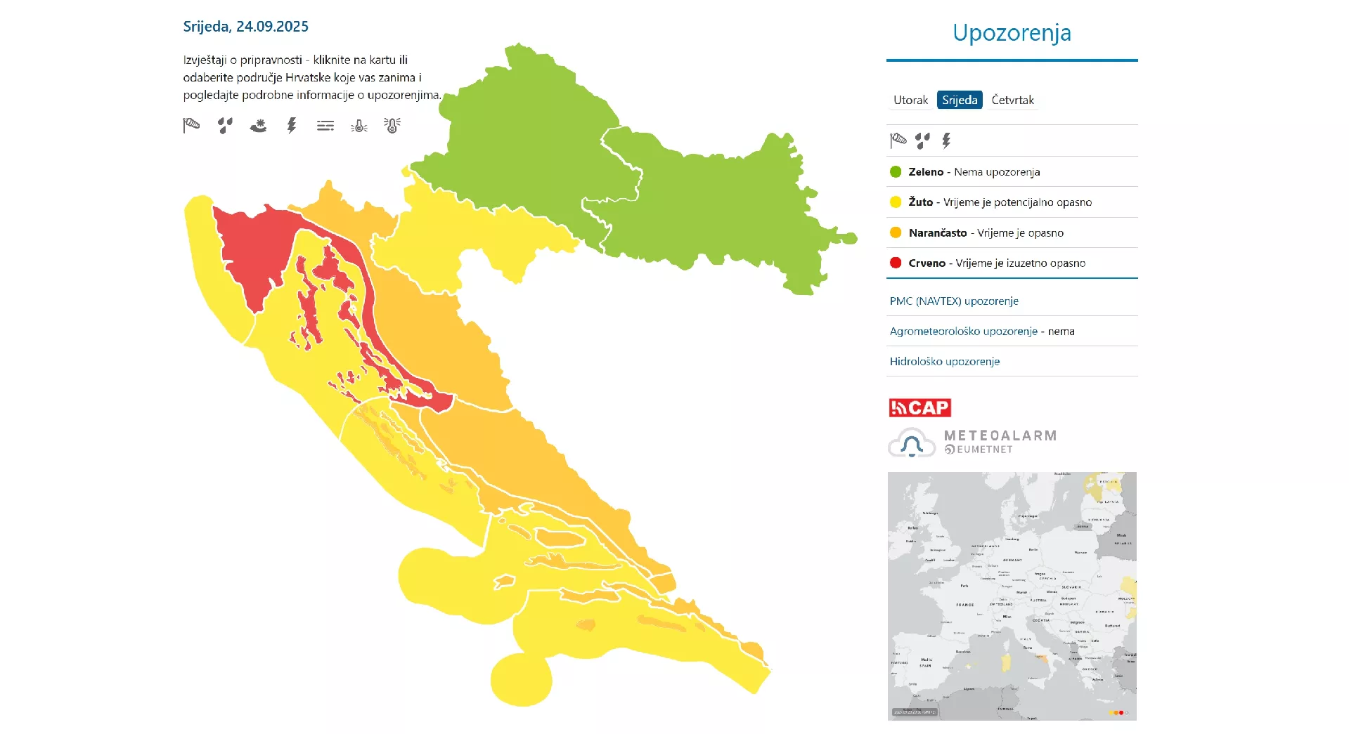 Žuto upozorenje vrijedi za Karlovačku regiju, uključujući Baniju. Za sjeverozapadnu i istočnu Hrvatsku u ovom trenutku nisu izdata upozorenja.