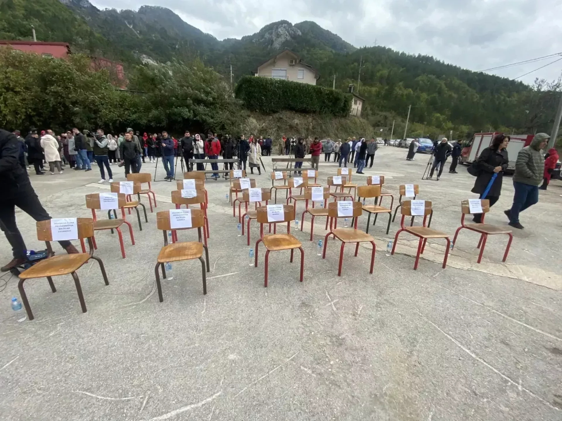 Redovi praznih stolica s natpisima rezervisanim za institucije i političke predstavnike stoje kao nijemi simbol odsutnosti onih koji su trebali biti uz narod.
