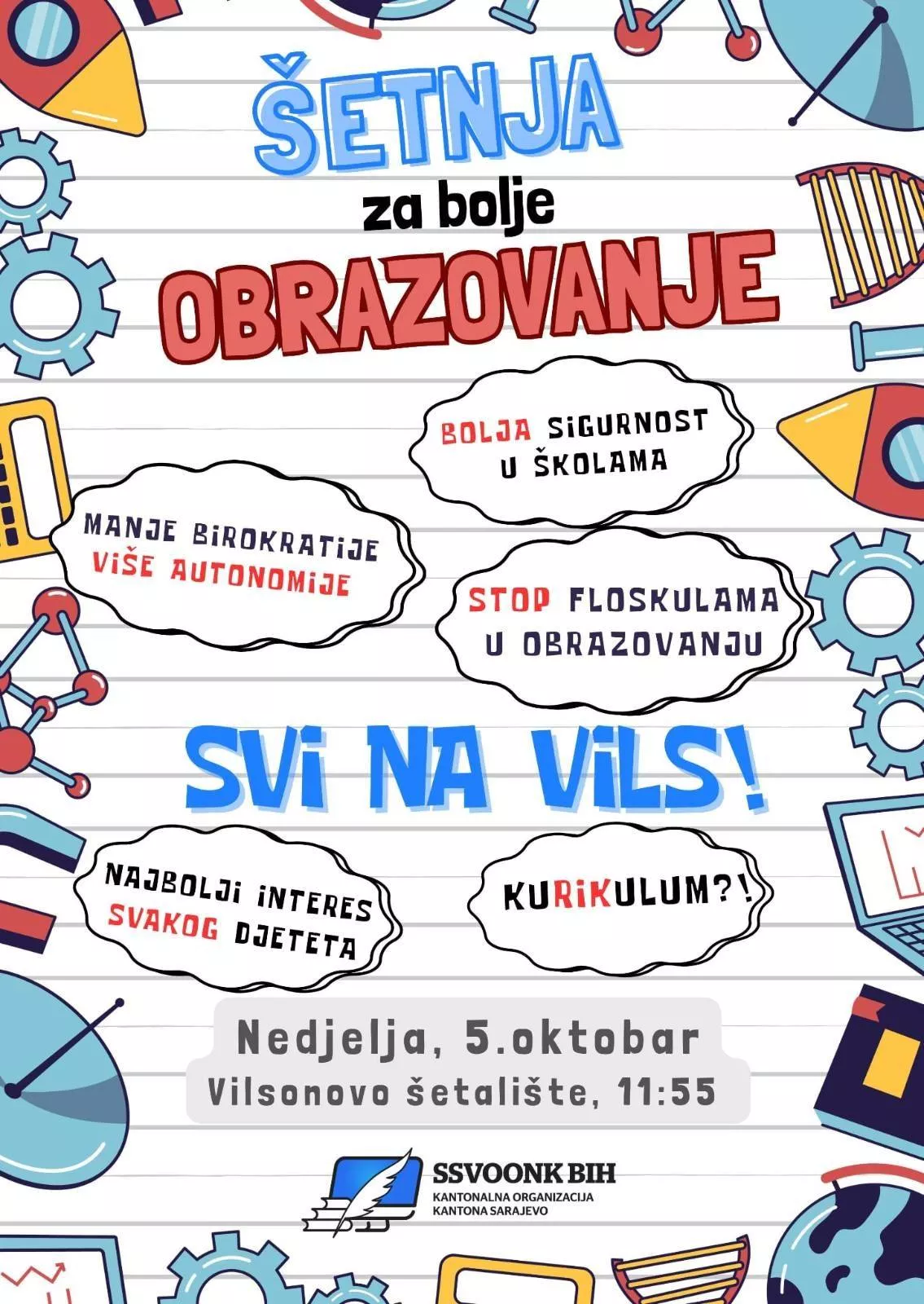 (Patria) - Povodom Međunarodnog dana učitelja, Sindikat srednjeg i visokog obrazovanja, odgoja i kulture Bosne i Hercegovine – SSVOONKBiH, Kantonalni odbor Kantona Sarajevo, u nedjelju 5. oktobra s početkom u 11:55, organizuje šetnju Vilsonovim šetalištem, od Treće gimnazije do platoa kod Zemaljskog muzeja, pod sloganom – "Šetnja za bolje obrazovanje".