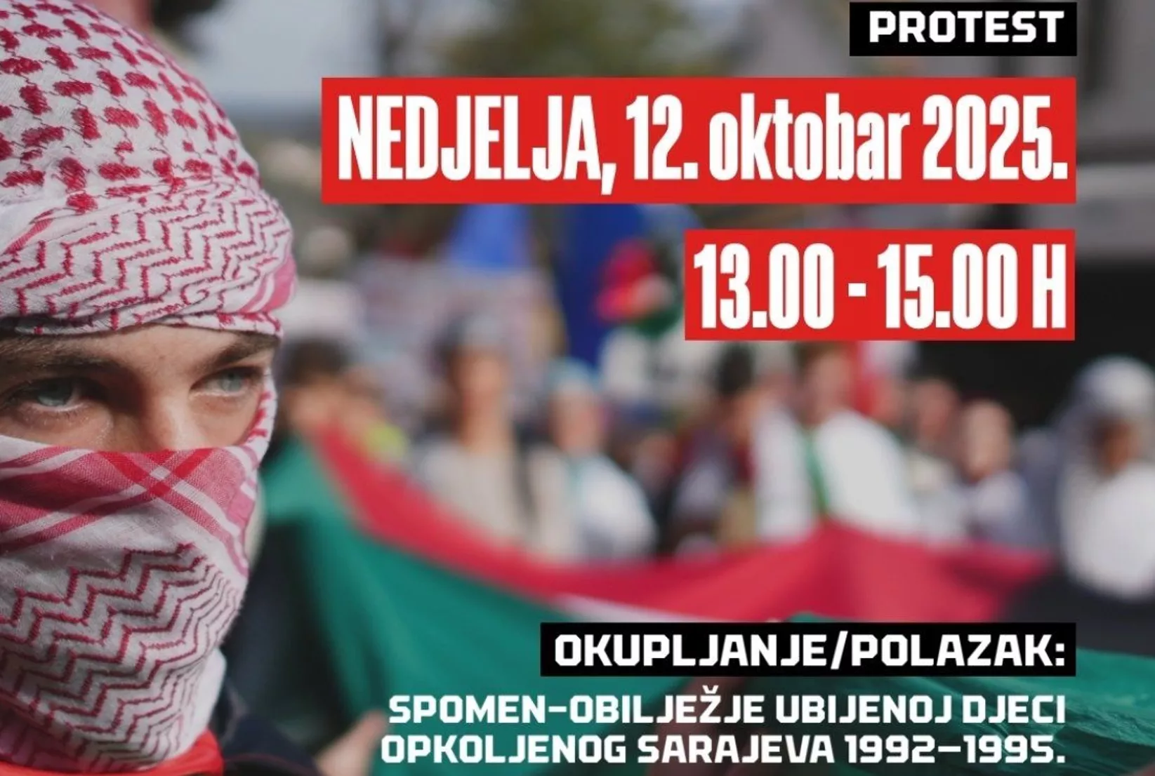 (Patria) - U Sarajevu će u nedjelju, 12. oktobra biti održan protest pod sloganom "Bosna i Hercegovina za slobodnu Palestinu", u organizaciji neformalne grupe građana.