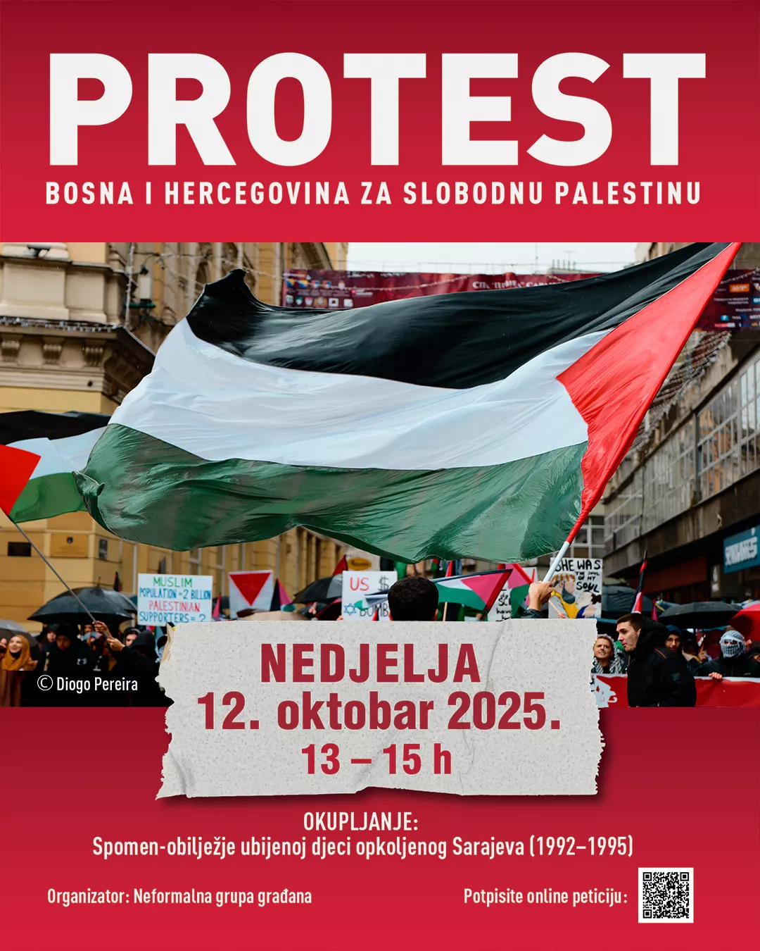 Protest počinje u 13:00 sati okupljanjem kod Spomen-obilježja ubijenoj djeci opkoljenog Sarajeva (1992–1995), a nastavlja se šetnjom do prostora između Zemaljskog muzeja BiH i Historijskog muzeja BiH, gdje će biti pročitani zahtjevi institucijama Bosne i Hercegovine za poštivanje međunarodnog prava, prekid saradnje s Izraelom i pokretanje konkretnih mjera podrške palestinskom narodu.