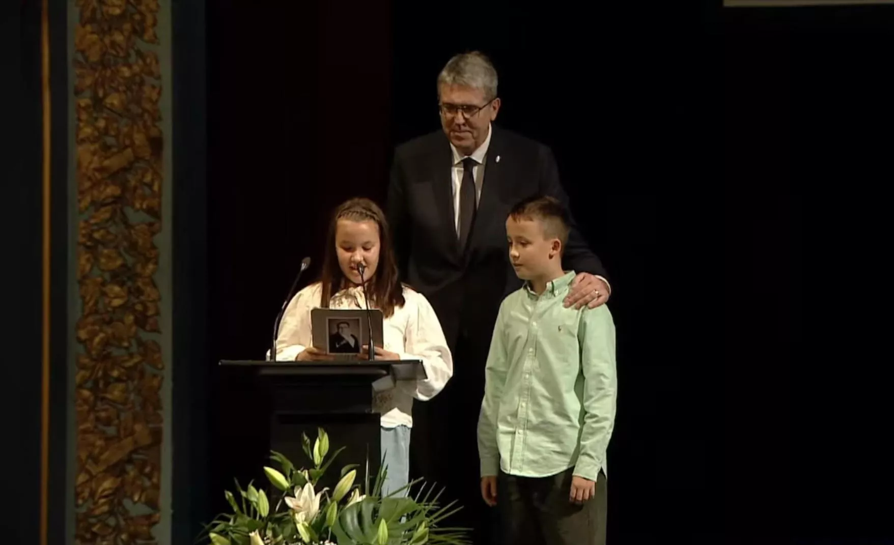 „Voljeli bismo da si još dugo s nama. Znaš, deda, mama nam nije rekla da si nas napustio, a mi smo znali. Deda, ti si naša ljubav, ponos i štit. Voljeli bismo da si tu. Kažu nam da tako mora biti, ali mi želimo da si još tu. Volimo te.“
