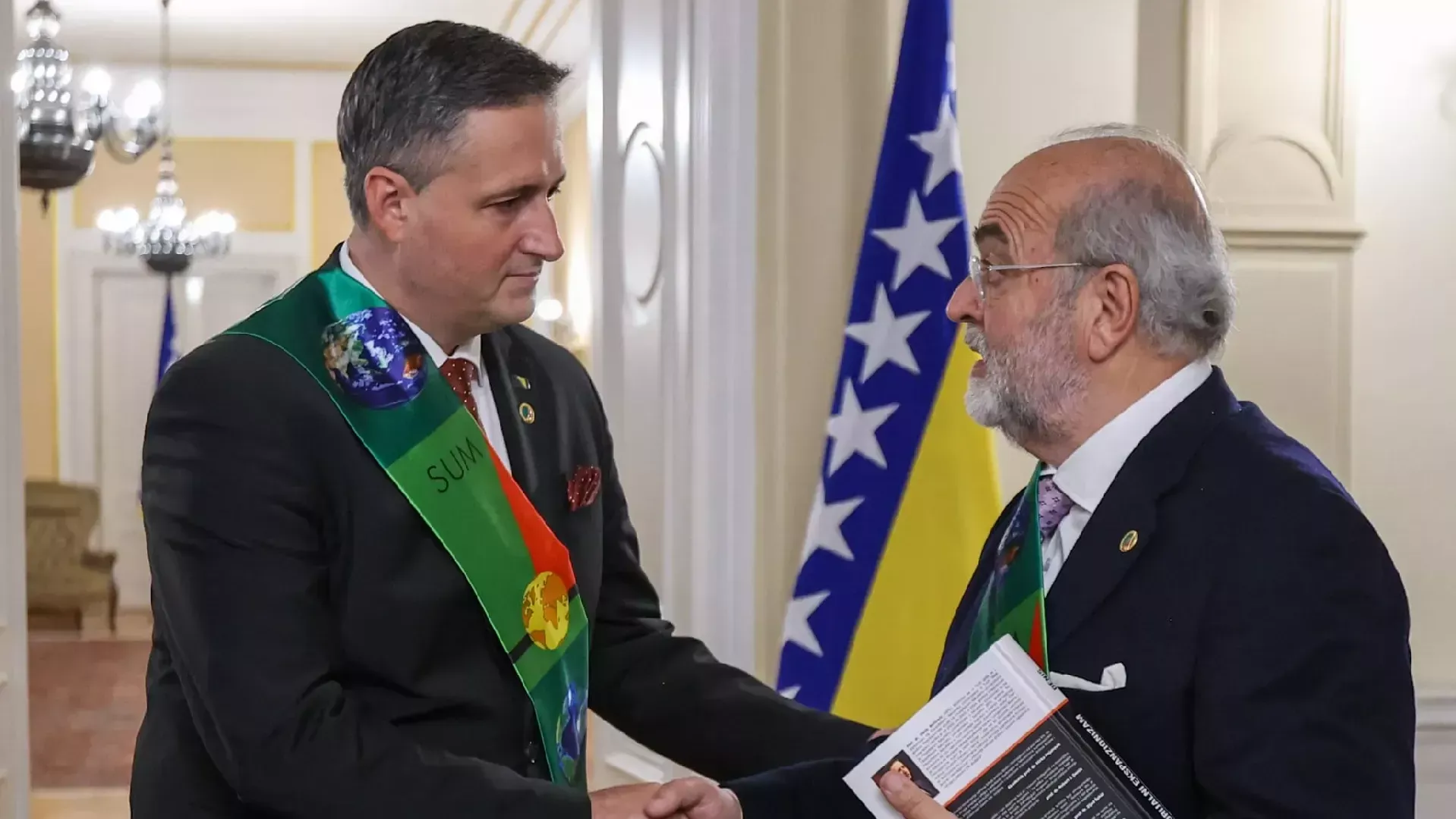 (Patria) - Članu Predsjedništva BiH Denisu Bećiroviću svečano je uručena Memorijalna mediteranska nagrada - posebno izdanje za 2025. godinu, koju organizacija Ujedinjenih država svijeta dodjeljuje Bosni i Hercegovini.