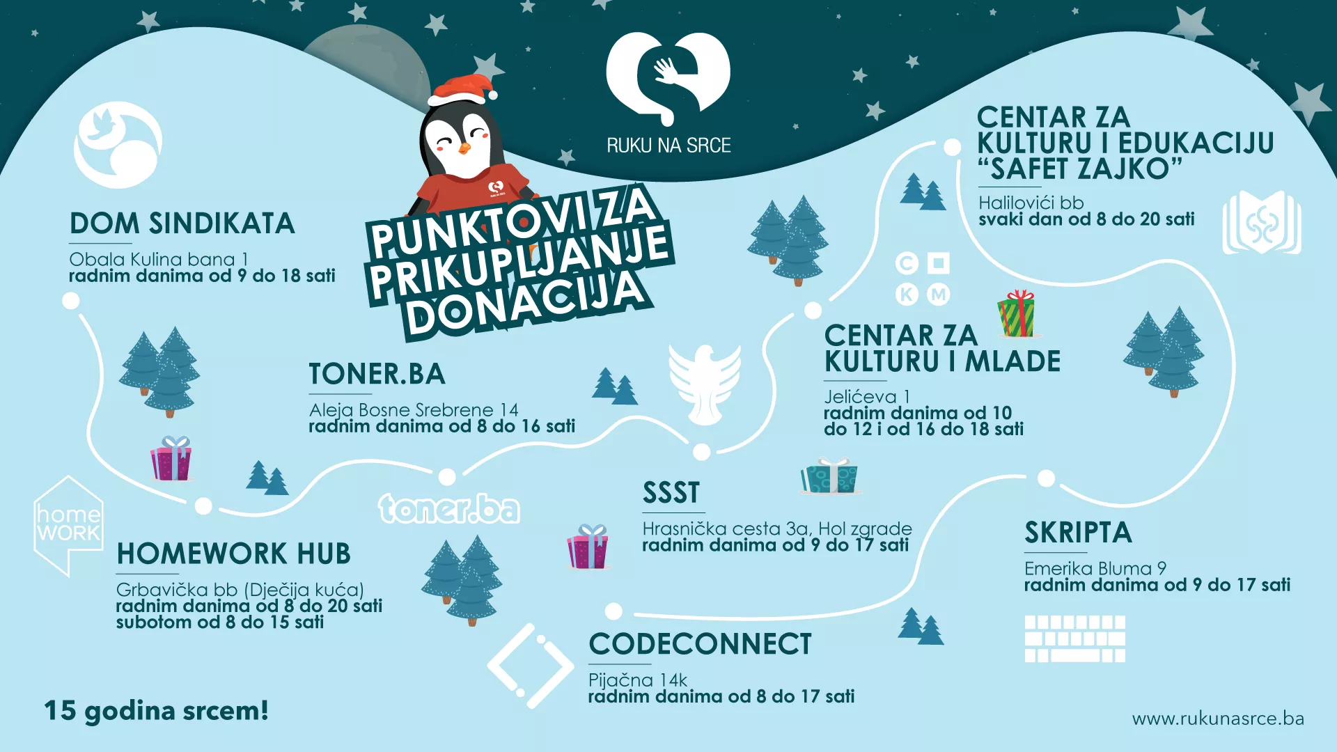 Upravo zbog toga, kako bi ova priča bila uspješna kao i pretodnih godina, Udruženje “Ruku na srce” poziva studente, školarce, sugrađane i predstavnike kompanija, udruženja i sportskih kolektiva da nas podrže i pomognu nam da ni jedan mališan ne bude bez novogodišnjeg paketića.