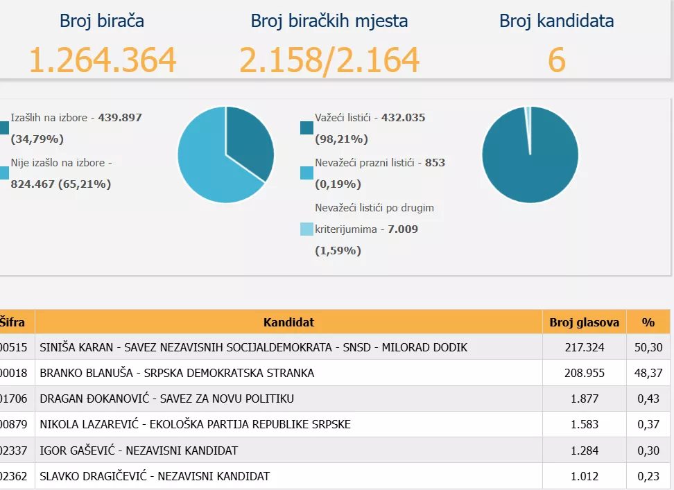 I dalje je u vodstvu Siniša Karan (SNSD) koji je osvojio 217.324 glasova, a drugi je Branko Blanuša (SDS) sa 208.955 glasova.