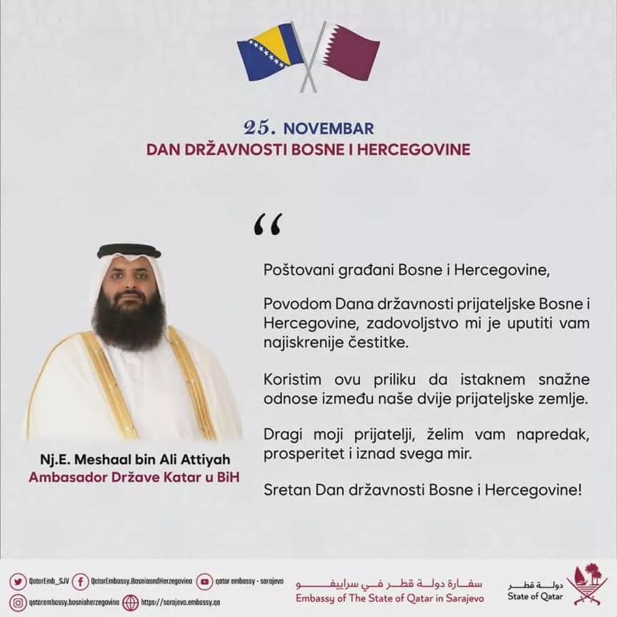 (Patria) - Kompletan državni vrh Katara uputio je danas čestitke najvišim zvaničnicima Bosne i Hercegovine povodom 25. novembra, Dana državnosti zemlje.