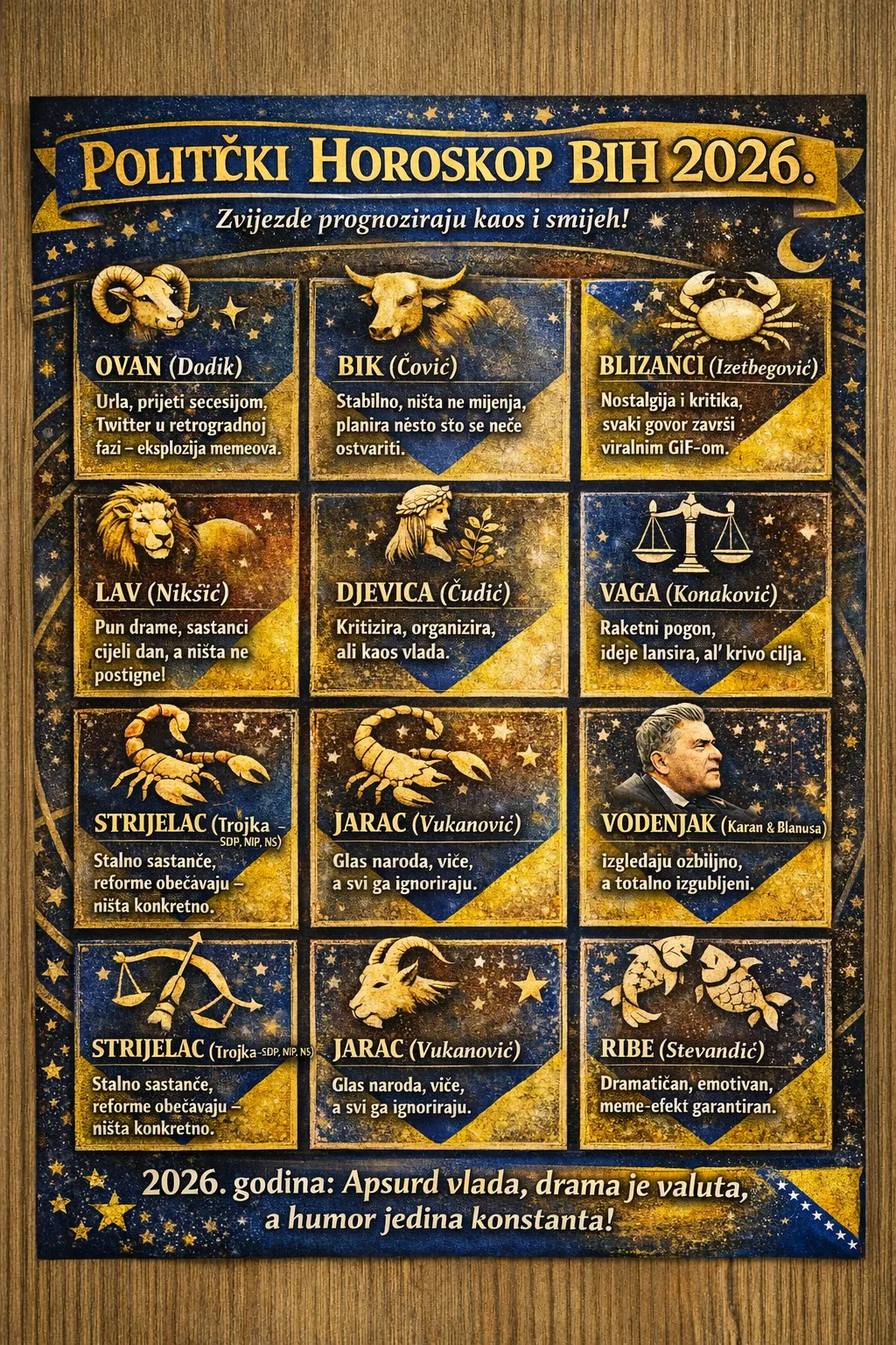 Zvijezde pokazuju da će Bosna i Hercegovina 2026. ostati zemlja gdje apsurd vlada, drama je valuta, a humor je jedina stabilna investicija. Publika će gledati predstavu, smijati se, aplaudirati i povremeno plakati, jer politika će i dalje biti kabaret bez kraja. Planetarne kombinacije sugeriraju - nemojte očekivati logiku, očekujte viralni haos.