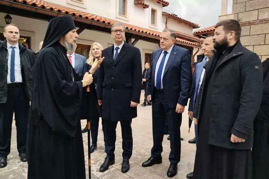 Vučića su u Mrkonjićima dočekali mitropolit zahumsko-hercegovački i primorski Dimitrije, predsjednik SNSD-a Milorad Dodik te gradonačelnik Trebinja Mirko Ćurić.