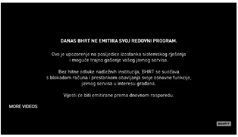 "Ova situacija nije rezultat naše volje, već posljedica dugogodišnjeg nepoštivanja zakona ove zemlje. Za nastavak rada BHRT-a potrebna je hitna reakcija PS BIH, Vijeća ministara BiH i OHR-a", naveli su iz BHRT-a.