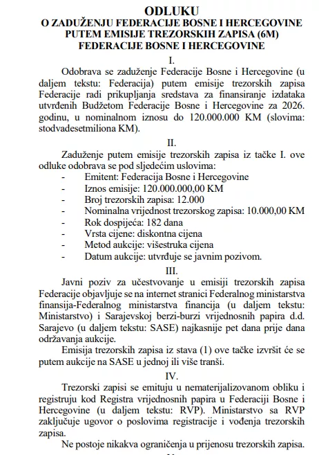 Po prvoj odluci FBiH će se zadužiti putem emisije trezorskih zapisa u nominalnom iznosu od 40 miliona KM, a rok dospijeća je devet mjeseci.