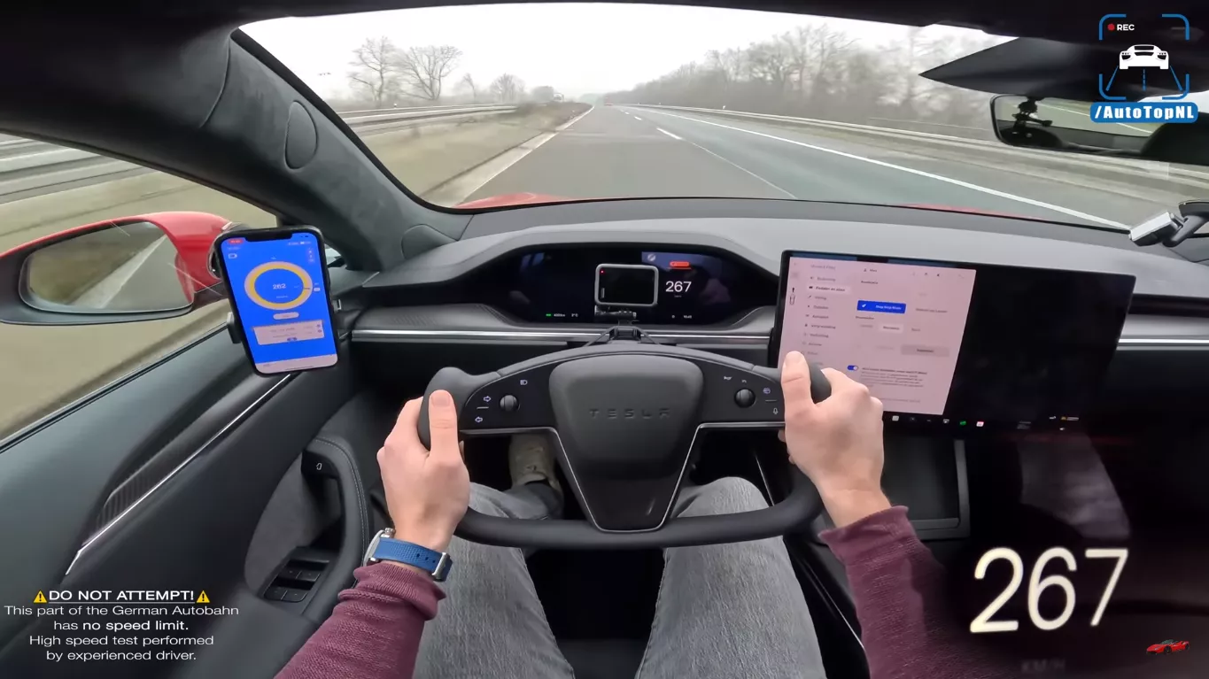 Tesla službeno navodi najveću brzinu od 321 km/h, iako je ona dostupna samo kroz određene hardverske nadogradnje. Inače, Model S Plaid elektronički je ograničen u normalnom radu na 267 km/h.