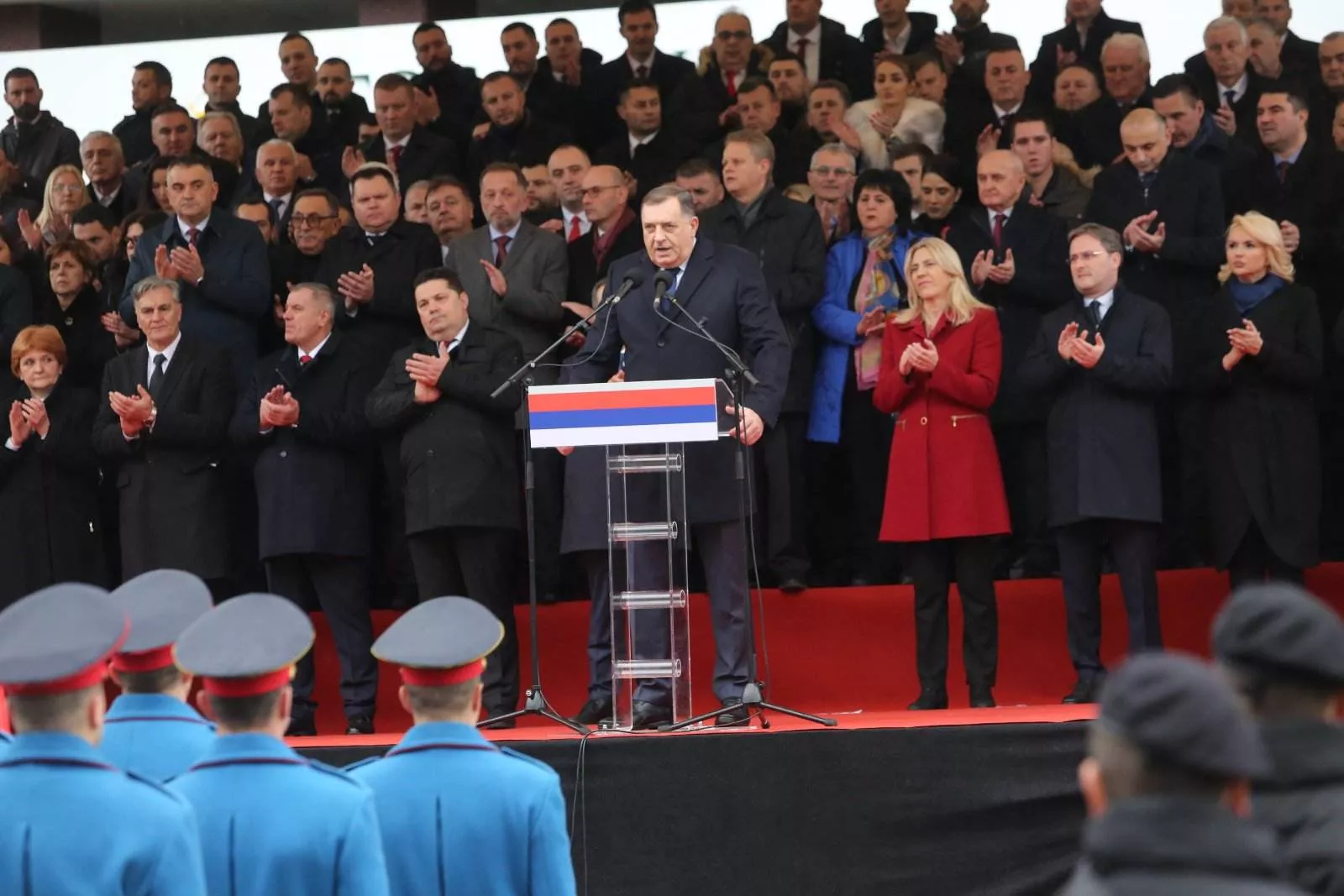 Čule su se i dvije himne, Rs-a i Srbije. Došli su gosti iz Srbije, Crne Gore. Iza Dodikovih leđa sin predsjednika Srbije Aleksandra Vučića Danilo Vučić, i ratnog zločinca Ratka Mladića. Saradnik Slobodana Miloševića sadašnji šef srbijanske diplomatije Ivica Dačić.