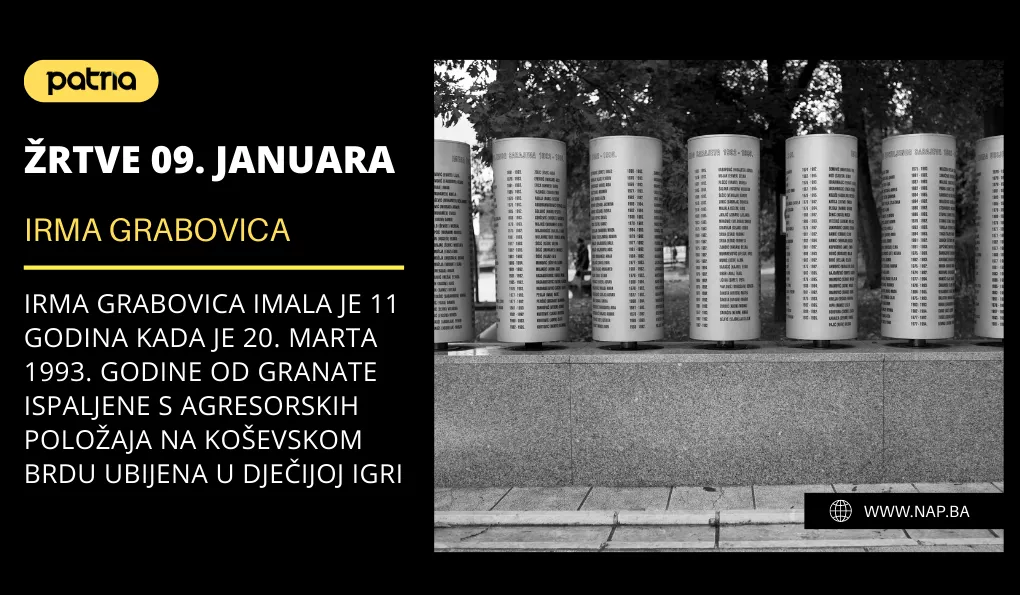 (Patria) - Irma Grabovica imala je 11 godina kada je 20. marta 1993. godine od granate ispaljene s agresorskih položaja na Koševskom Brdu ubijena u dječijoj igri.