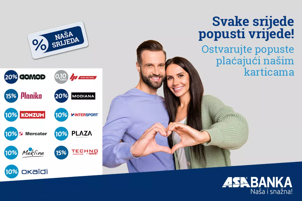 "Kako bi omogućili svojim klijentima da kupuju kvalitetne proizvode, istovremeno ostvarujući značajne uštede, svake srijede do kraja godine plaćajući ASA Banka karticama klijenti ostvaruju popuste u Domodu, Mercatoru, Konzumu, Okaidi, Techno shop, Planika i Peko prodavnicama, kao i Intersportu, Plazi, Modiani, Meklineu i na Hifa Petrol benzinskim pumpama“, ističu iz ASA Banke, te dodaju kako je kroz ovaj program cilj klijentima pružiti dodatnu vrijednost koju mogu ostvariti kroz popust i do 20% u nekim trgovinama.