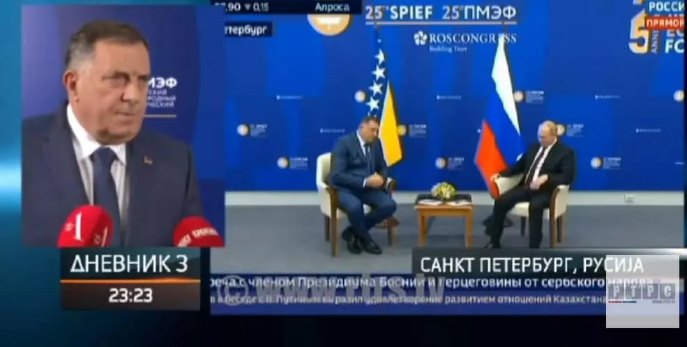 (Patria) - Član Predsjedništva BiH Milorad Dodik sastao se u petak kasno navečer u Sankt Peterburgu sa ruskim predsjednikom Vladimirom Putinom. Iza Milorada Dodika bila je zastava BiH.