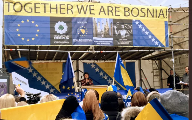 (Patria) - Na protestu bosanskohercegovačke dijaspore u Briselu, kojim se podiže svjesnost o trenutnim dešavanjima i političkim tenzijama u BiH, obratila se zastupnica u Europskom parlamentu Tineke Strik, upozorivši da situacija podsjeća na onu iz 1990-ih i pozivajući Europsku uniju da slijedi primjer Sjedinjenih Američkih Država uvođenjem sankcija.