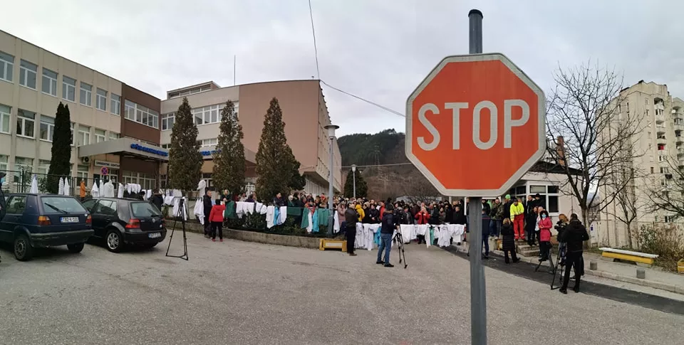 (Patria) - U krugu Opće bolnice nema više okupljenih ljekara i zdravstvenih radnika, samo okačeni bijeli mantili koji šalju prejaku poruku, da je država ostavila na cjedilu ljude koji spašavaju živote.