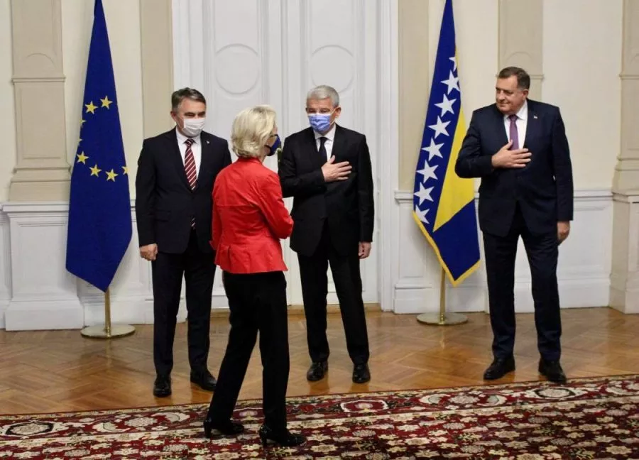 SARAJEVO, (Patria) - Ursula von der Leyen, predsjednica Evropske komisije doputovala je danas u Bosnu i Hercegovinu. Sva tri člana Predsjedništva BiH su je dočekali u ovoj državnoj instituciji.