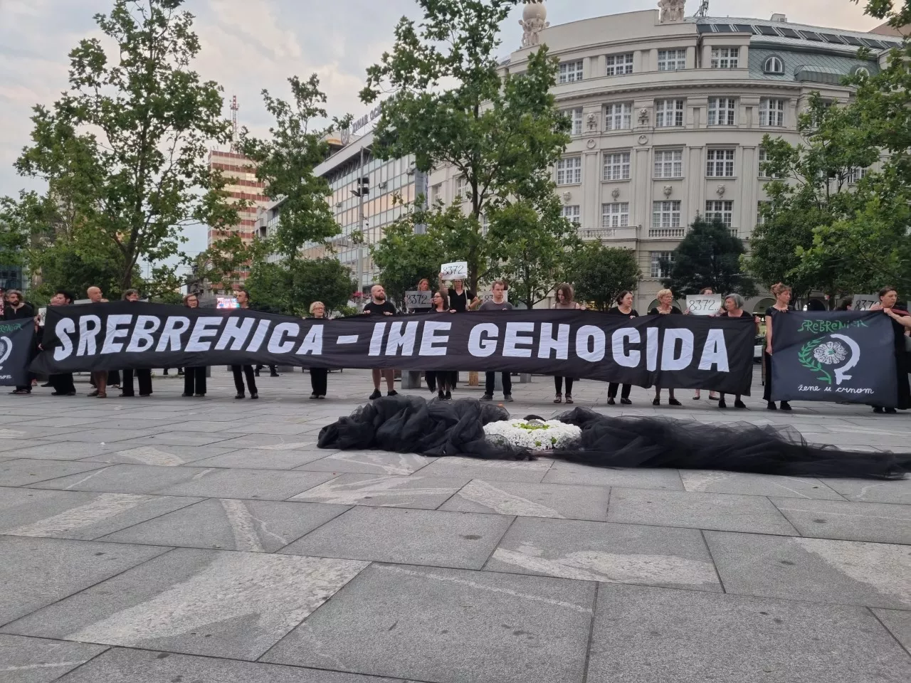 Na performansu Žene u crnom su raširile crnu tkaninu, na čijem je kraju položen vijenac od bijelog cveća i kamen sa natpisom 8.372.